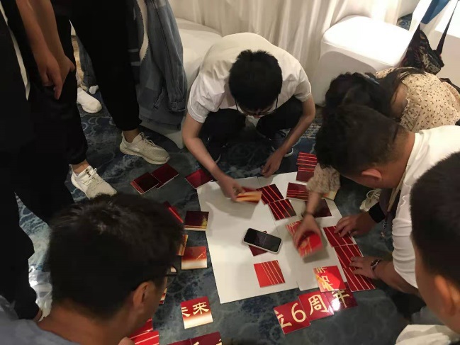 各組的小伙伴們獻(xiàn)計獻(xiàn)策,不斷的互相尋求幫助,雖然是比賽,但是大家似乎已經(jīng)忘記各組的得失,互相指導(dǎo),一組一組的完成了每一部分的拼接。為了節(jié)約時間,八個小組中提前拼接好的部分先進(jìn)行組裝,沒有總指揮、沒有領(lǐng)導(dǎo)者、唯一的信念就是快速完成背景板的拼接。最終在30分鐘之內(nèi)完成了拼圖。比我們活動策劃的預(yù)計時間提前了一個小時。
