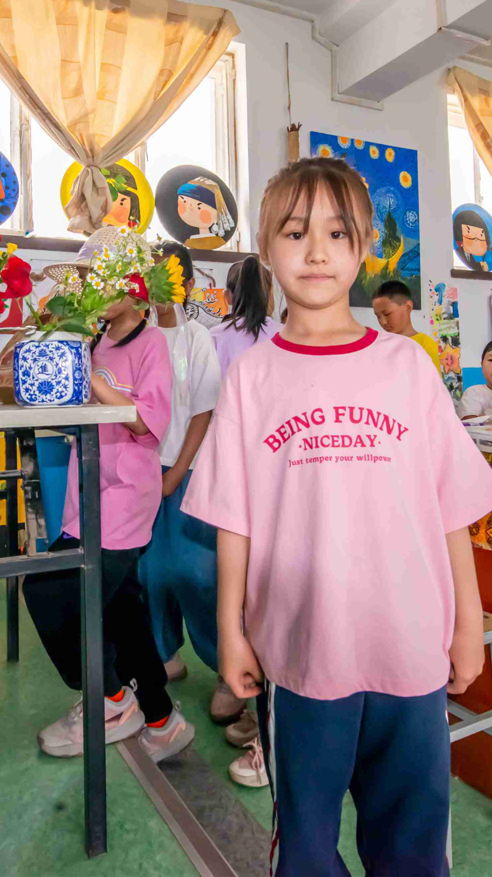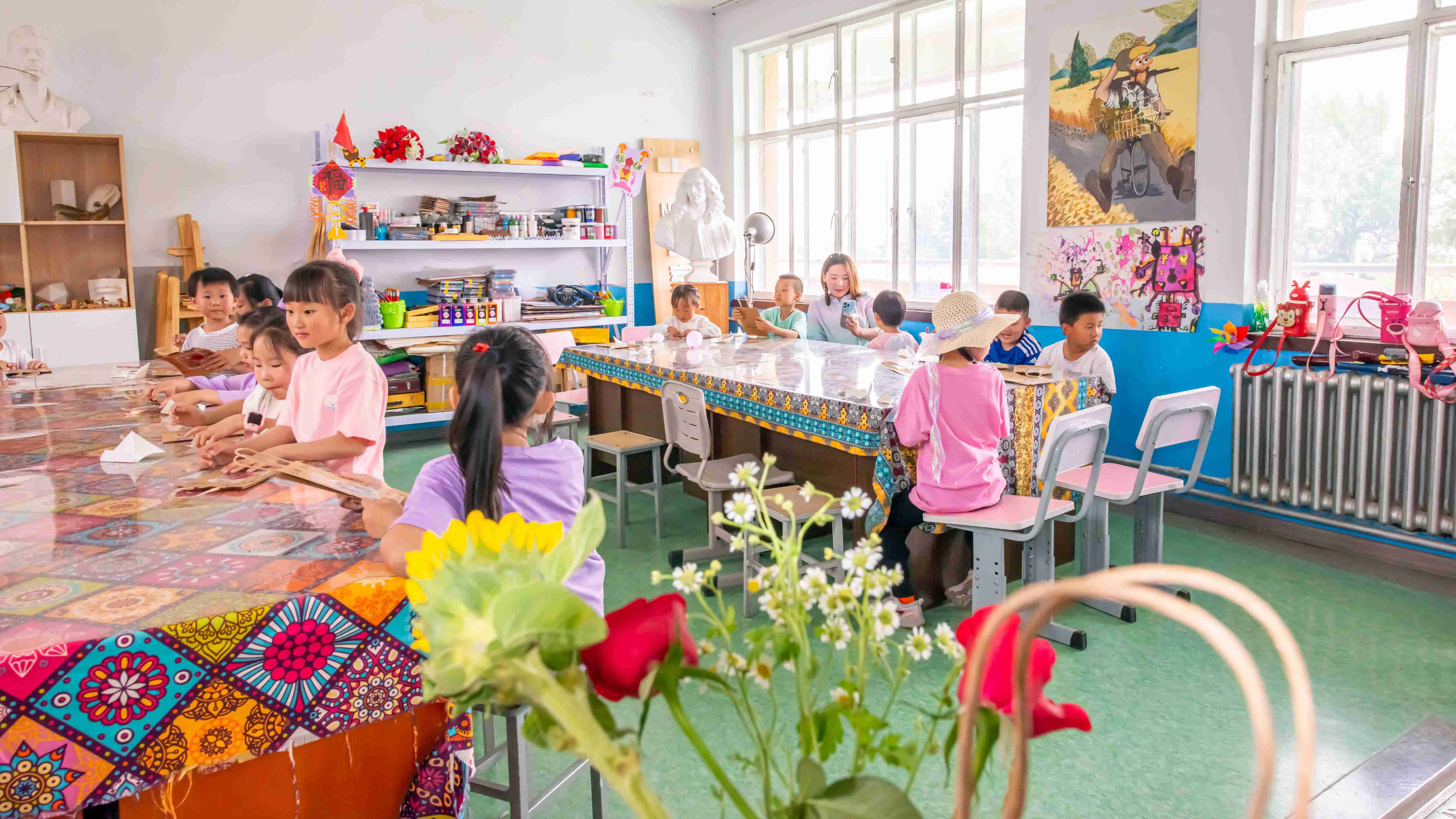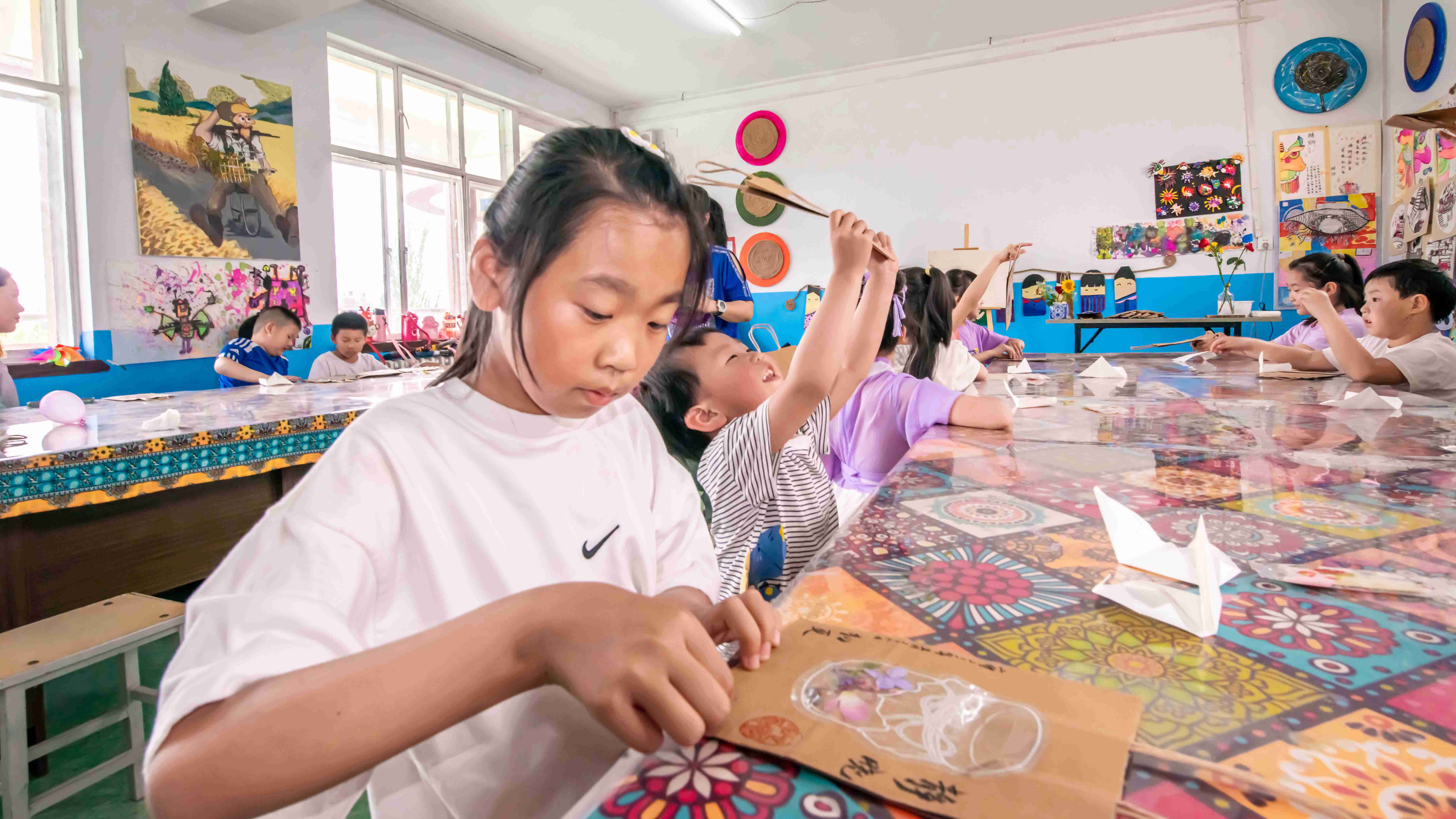 組織孩子們繪畫的老師帶領(lǐng)孩子們來(lái)到繪畫教室,開啟活動(dòng)的第一項(xiàng)—手提袋創(chuàng)意標(biāo)本裝飾畫。首先老師開始發(fā)放材料包,將提前準(zhǔn)備好的手提袋、制作植物標(biāo)本的材料發(fā)到孩子們的手中。