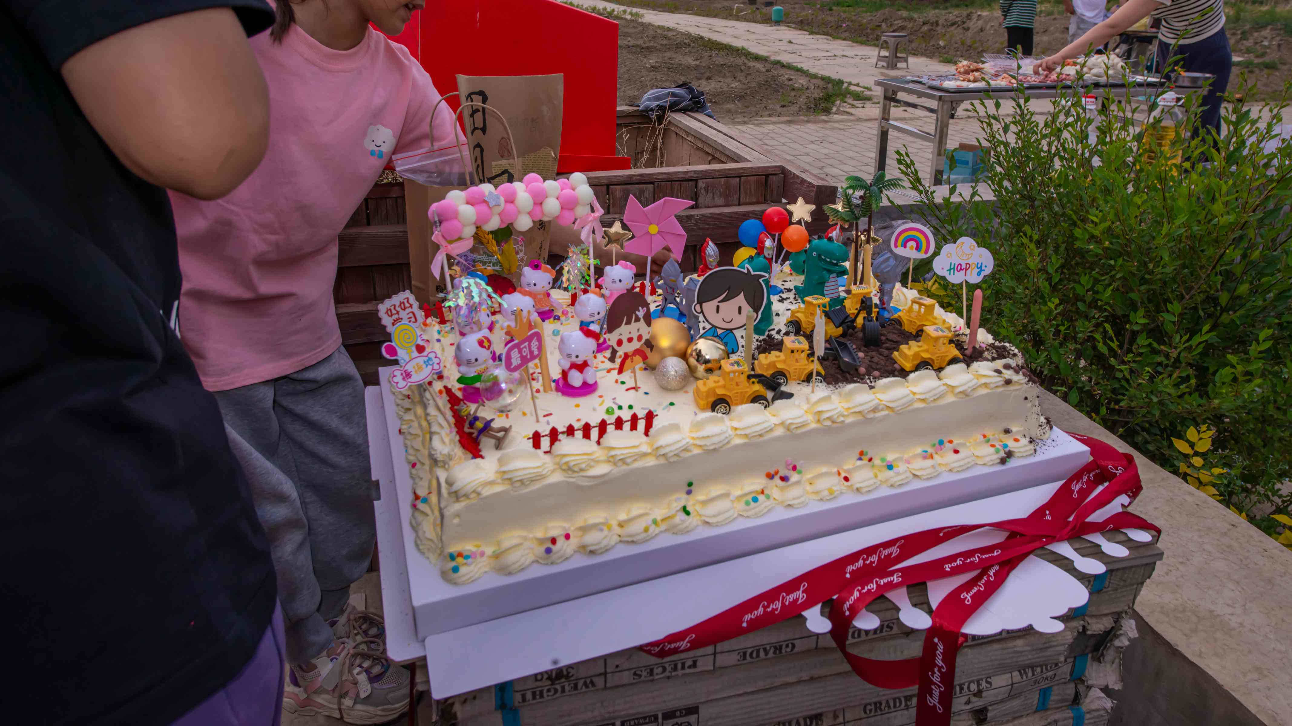 為孩子們提前準(zhǔn)備的繽紛大蛋糕上桌了,小朋友簇?fù)矶?,看著美麗的大蛋糕,大家迫不及待的拍照合影?br />