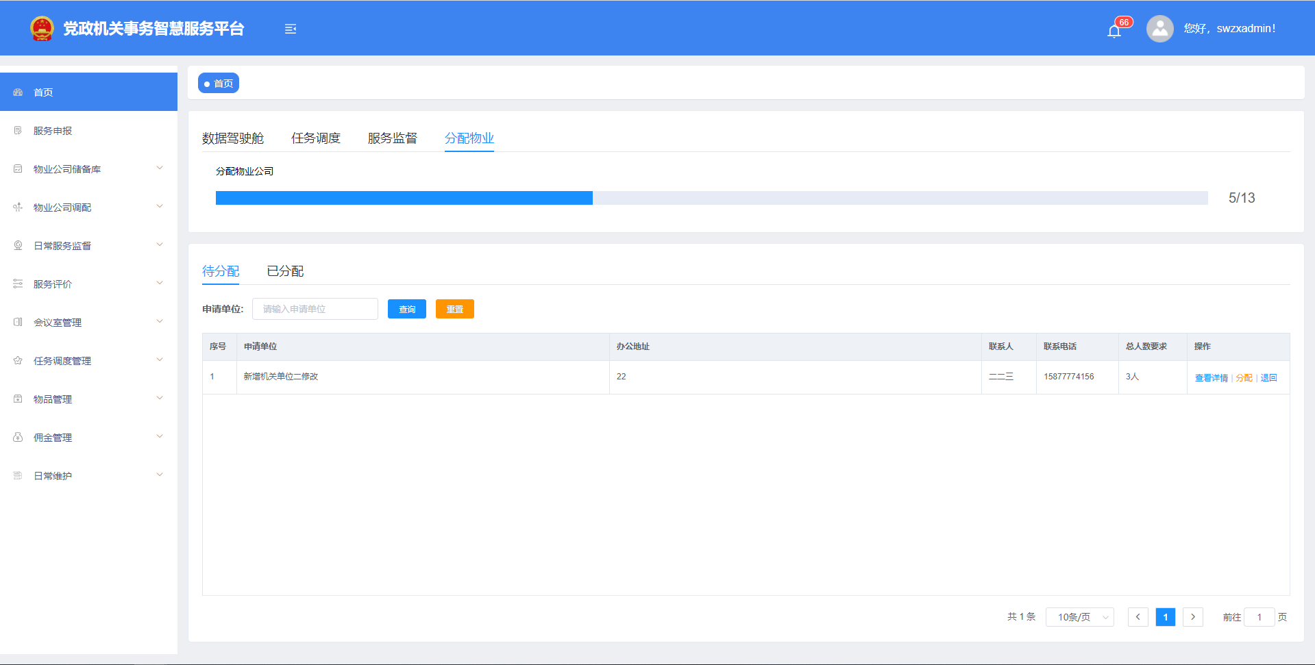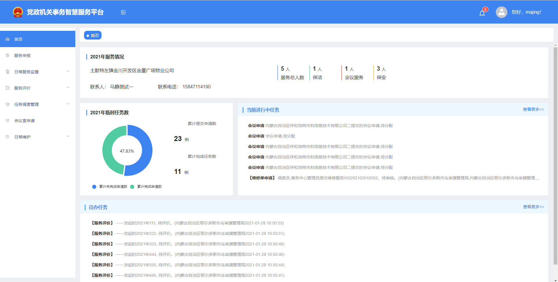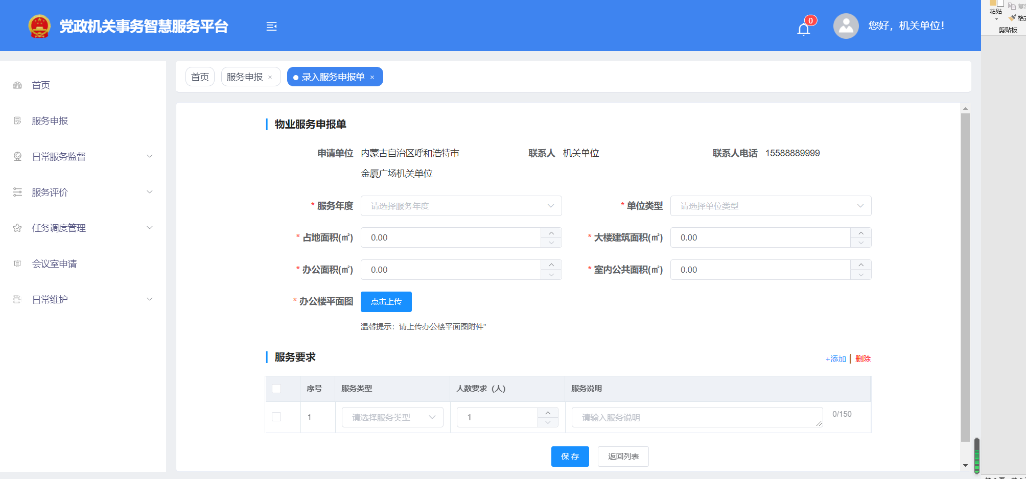 內蒙古和利信息技術有限公司(和利信息)按照國家機關事務管理局“一體兩翼”堅持集中統(tǒng)一管理、堅持以標準化、信息化為支撐為發(fā)展思路,在深入研究我區(qū)機關事務物業(yè)服務現(xiàn)狀的基礎上,同時堅持把物業(yè)服務實現(xiàn)科學化管理、標準化保障、精細化服務作為系統(tǒng)研發(fā)指導思想。為我區(qū)黨政機關事務管理局(中心)研發(fā)了“黨政機關物業(yè)服務系統(tǒng)”,該系統(tǒng)實現(xiàn)了本級黨政機關、事業(yè)單位辦公樓宇物業(yè)服務公司實現(xiàn)標準化和信息化管理,所有單位統(tǒng)一物業(yè)管理服務標準化、規(guī)范化、精細化、智慧化服務,利用信息化手段推進黨風廉政建設和節(jié)約型機關建設。該系統(tǒng)可對物業(yè)公司、物業(yè)服務、服務質量、物業(yè)傭金費等進行集中管控,同步實現(xiàn)了物業(yè)服務申報、物業(yè)公司分配、任務調度管理、會議室管理、日常服務監(jiān)督管理、服務評價管理、物品管理、傭金管理、日常維護、物業(yè)公司儲備庫和物業(yè)公司調配等基礎功能(含小程序端)。系統(tǒng)分為4個使用端:分別為機關事務管理局(中心)監(jiān)管端、黨政機關物業(yè)服務端、物業(yè)公司管理端和物業(yè)員工日常工作記錄端,下面按場景進行系統(tǒng)介紹。
