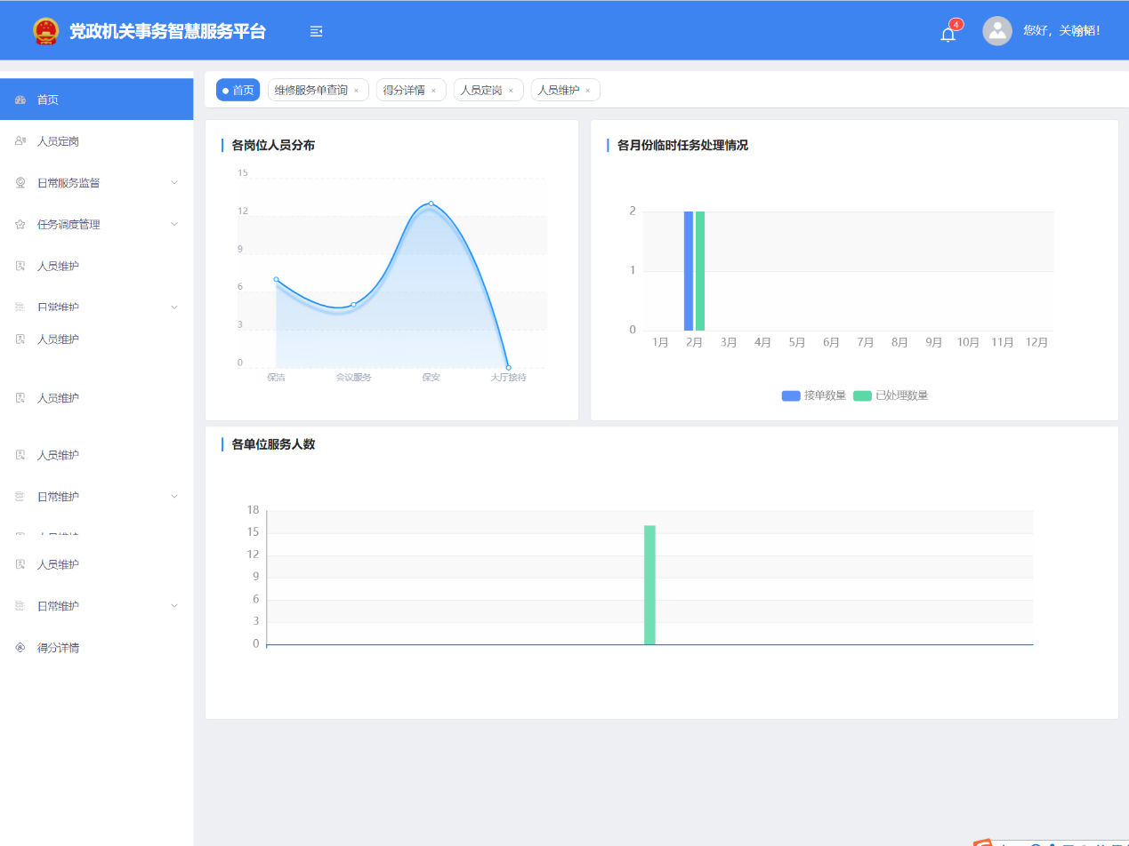 對服務人員進行維護,查看服務人員打卡情況、查看機關事務中心和黨政機關對自己的評價,查看本單位下日常檢修、消火栓、能源記錄和日常維修的記錄。在手機端為維修單分配維修人員,查看維修記錄,查看本單位下日常檢修、消火栓、能源記錄和日常維修的記錄,并可以查看本單位下所有服務人員的通訊錄。