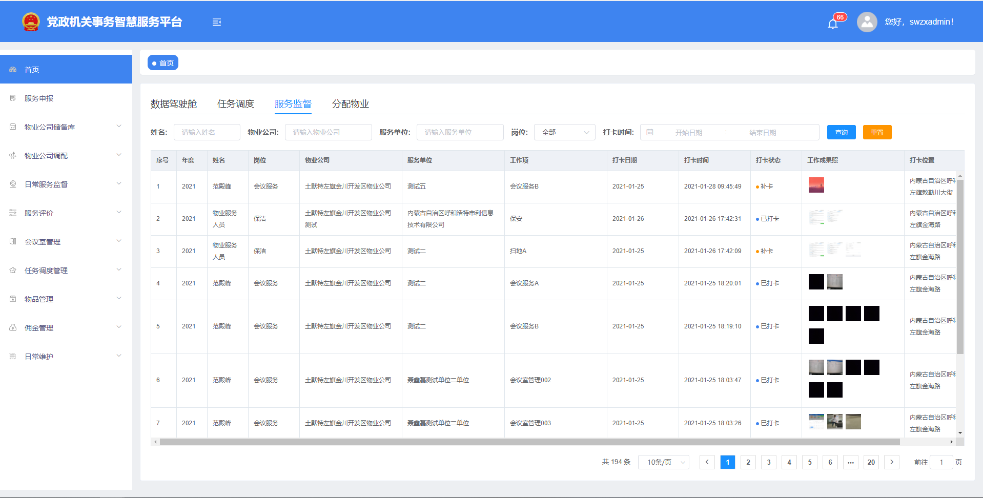 服務申報的審批,物業(yè)公司的分配,維修服務審批和會議申請的分配等審批工作。還可以維護物品、維護傭金、維護物業(yè)公司和黨政機關信息。查看物業(yè)公司服務人員打卡情況,查看檢修、消火栓、日常維修和能源的記錄,還可以對物業(yè)公司進行評價。